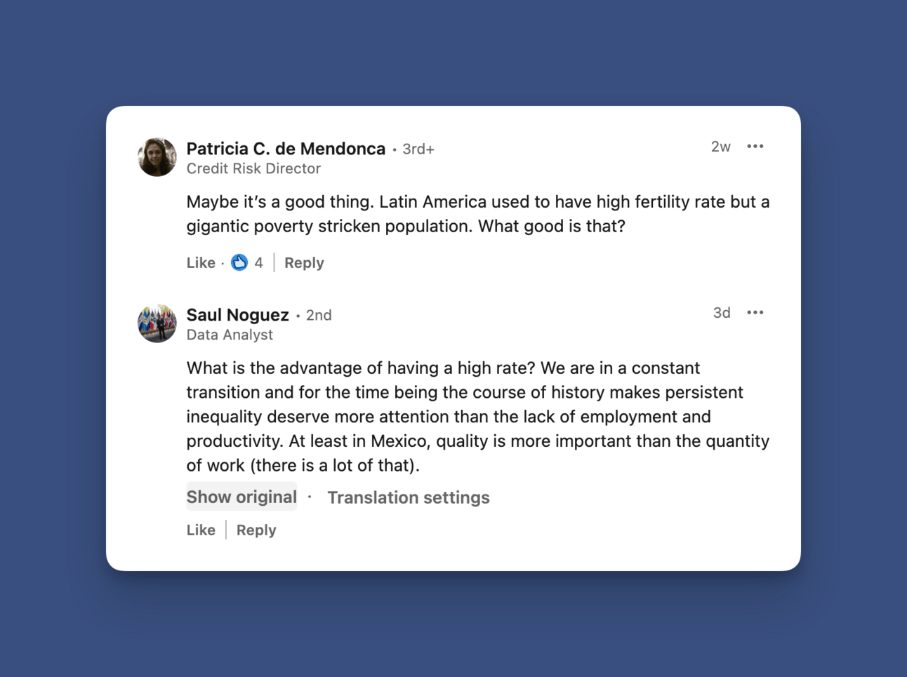 Patricia and Saul weigh in on why they think that low fertility rates might be a good thing.