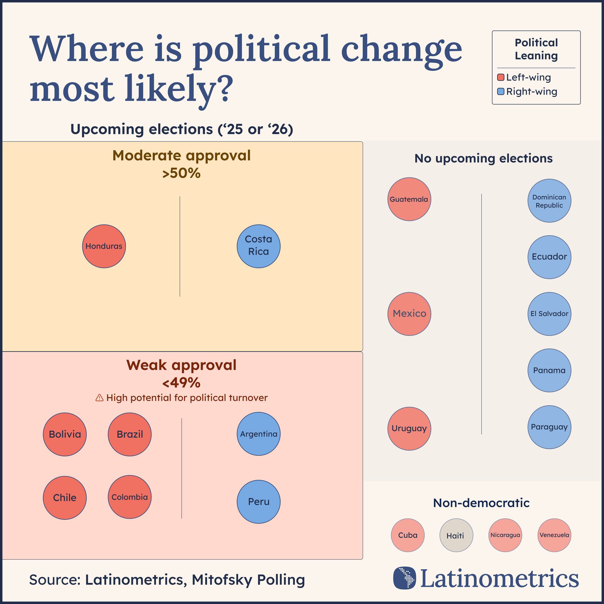 Take Chile and Colombia. Both Gabriel Boric and Gustavo Petro are on their way out, with their stubbornly low approval ratings meaning it’s likelier than not they’ll be replaced by an ideological adversary. The frontrunner in this year’s Chilean election, for example, is ultraconservative José Antonio Kast, who’s about as ideologically far from Boric as possible.