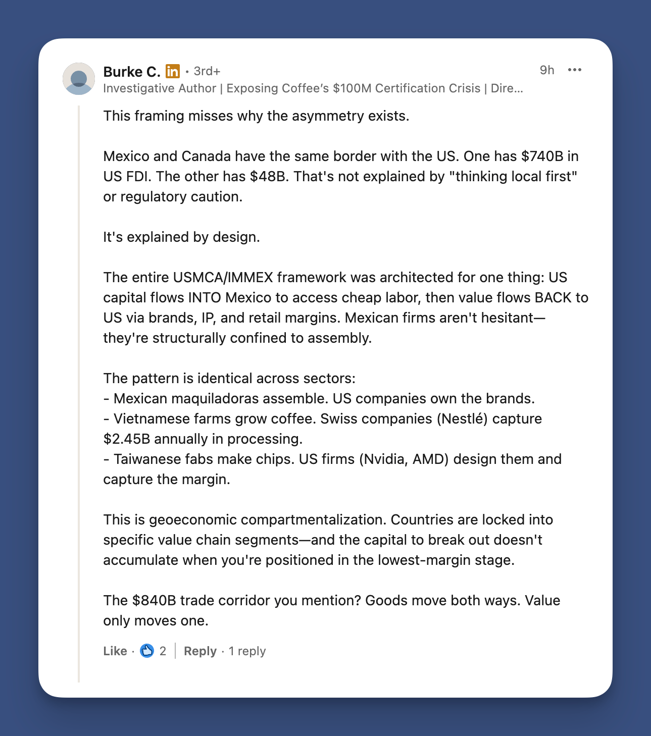 Burke summarizes a perspective not uncommon in Latin America: That trade is a net negative for the countries with cheap labor.
